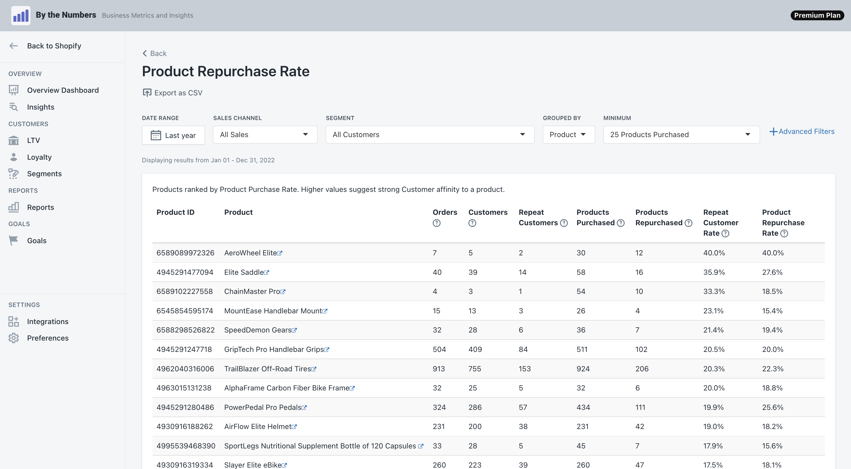 In summary, the Product Repurchase Rate report in By the Numbers provides valuable insights into the behavior of repeat customers in relation to specific products in your store. Use this report to identify which products have the highest customer loyalty, and develop targeted marketing efforts to encourage repeat purchases and increase customer loyalty.